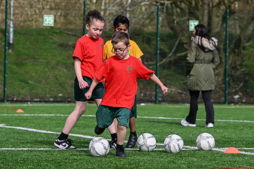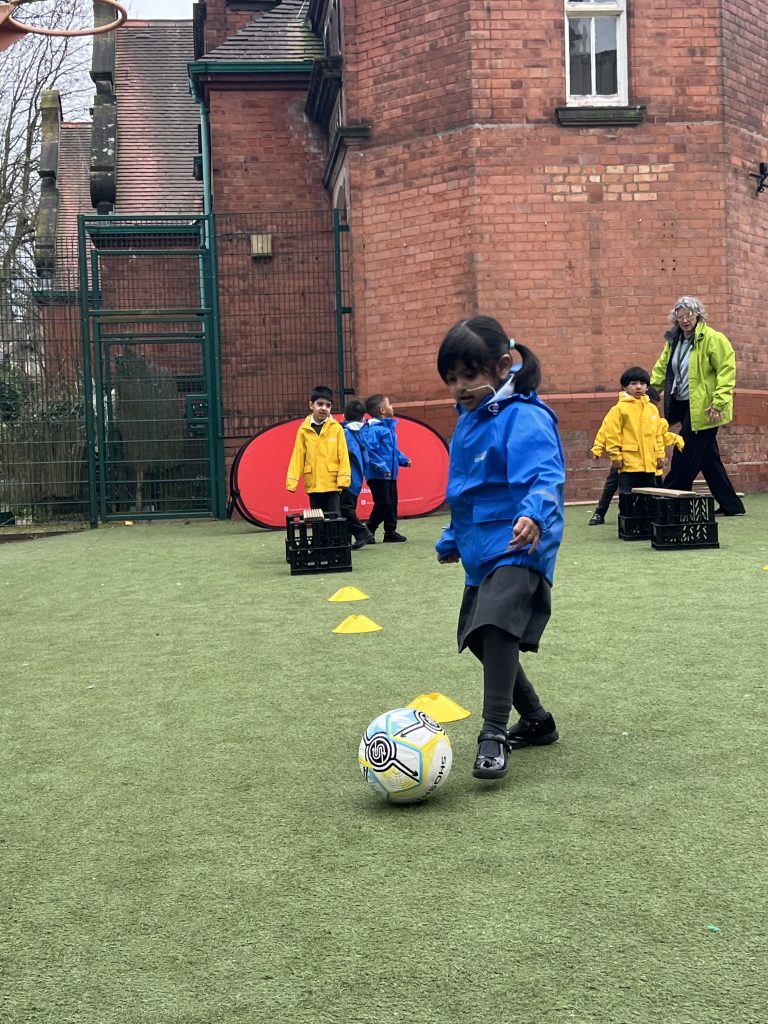 The ESFA team visited Grove Primary School in Handsworth, Birmingham, where pupils from reception up to year 6 took part in various football activities. The reception children practised their balancing and learned to dribble the ball, weaving in and out of cones. We saw two potential England Lionesses of the future with great control of the ball, showing their determination to improve and score goals.